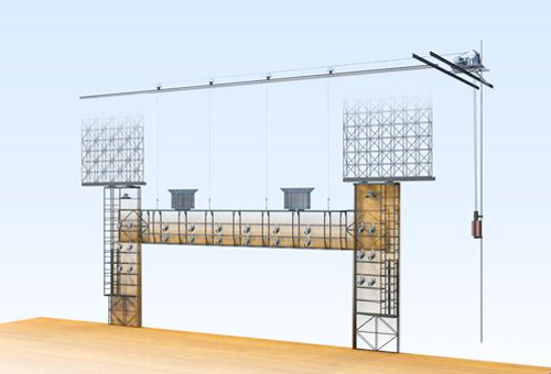 1.設(shè)置于舞臺臺口內(nèi)側(cè)的假臺口,由上片和兩側(cè)片組成。通過上片和側(cè)片位置 的變化,可以調(diào)整舞臺開口的大小,即可以將開口縮減。2.假臺口上片和兩側(cè)片鋼結(jié)構(gòu)形式要便于安裝舞臺燈具。同時為固定設(shè)置追光 燈提供便利,可上人操作使用燈具。3.假臺口上片由電動提升或下降,側(cè)片為手動平移并設(shè)有導(dǎo)向裝置。 4.假臺口上片、側(cè)片分別由帶導(dǎo)軌的鋼制框架,驅(qū)動系統(tǒng)和控制系統(tǒng)構(gòu)成。設(shè)有備用系統(tǒng),可以手動操作復(fù)位。 具體由下述部分組成: ·上片為兩層鋼制框架,兩端設(shè)有常閉式防護門,并通過"碼頭"與天橋相連。 側(cè)片為多層鋼制框架。操作面應(yīng)敷設(shè)絕緣防滑橡膠板和踢腳板。 ·上片的卷揚系統(tǒng)由電動機、減速器、兩個獨立的制動器、卷筒等組成。側(cè) 片驅(qū)動機構(gòu)由行走輪、導(dǎo)向系統(tǒng)等組成。 ·導(dǎo)軌 ·滑輪組件 ·上片用平衡重時、應(yīng)設(shè)平衡重架、導(dǎo)軌和防護網(wǎng) ·鋼絲繩和配件 ·有提升、下降和緊急停車按鈕的操作盤可以實現(xiàn)就地操作。應(yīng)與其它相關(guān) 設(shè)備和安全防護門動作聯(lián)鎖。 5.為燈光、音響電纜進入假臺口提供良好的條件和必要的裝置。渡橋的兩側(cè)應(yīng) 便于安裝燈具,設(shè)垂直電纜收納裝置和水平電纜布線裝置。
